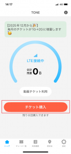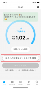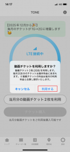 1 TONEアプリ起動後、「当月分の動画チケット2枚を利用」をタップします。 ※当月分の動画チケットを利用済みの場合、このボタンは表示されません。 |