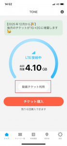 1 TONEアプリ起動後、「動画チケット利用」をタップします。 |