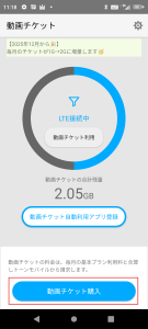 2 「動画チケット購入」をタップします。 ※1GB220円(税込)で、月8回まで購入可能です。 |