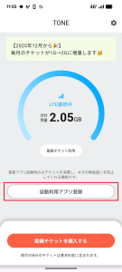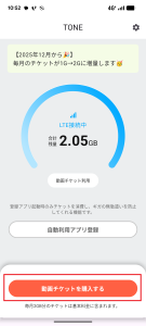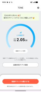 初期設定時にAndroid端末にインストールした「TONE」アプリより、プラン内の1GB動画チケットの利用設定や動画チケットの追加購入をすることができます。